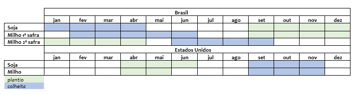 As condições edafoclimáticas diferentes no Brasil e nos Estados Unidos os colocam em momentos opostos em relação à oferta. Acompanhe a dinâmica de plantio e colheita dos países na tabela 1.