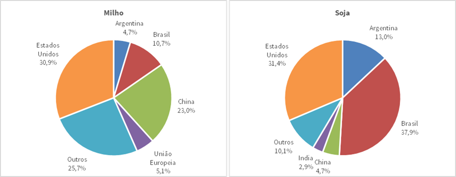 Juntos, os países são responsáveis por cerca de 64,6% da produção mundial de milho e 74,0% da produção mundial de soja. Veja na figura 1.
