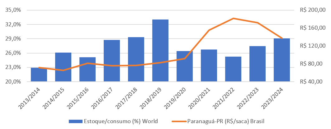Com o aumento na estimativa de produção e manutenção na demanda total, o estoque final para a Safra 2023/24 foi estimado em 7,6 milhões de toneladas, contra 6 milhões em junho.