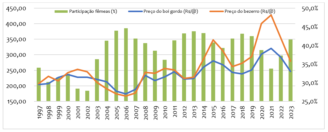 Do lado da oferta, os bezerros que estão no mercado hoje refletem a estação de monta em 2022 – primeiro ano de aumento no descarte de fêmeas no país – ou seja, há menor oferta nesse momento do que há um ano.