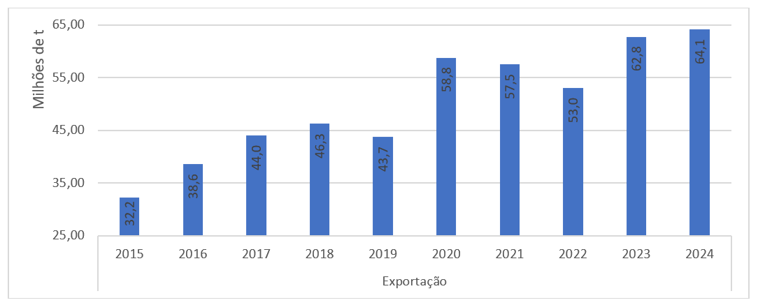 Figura 3. Exportação brasileira de soja em grão, em milhões de toneladas, no primeiro semestre.