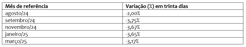 Tabela 1. Variação, em trinta dias, dos contratos futuros da soja na Bolsa de Chicago nos principais meses de referência – fechamento em: 23/07/24.