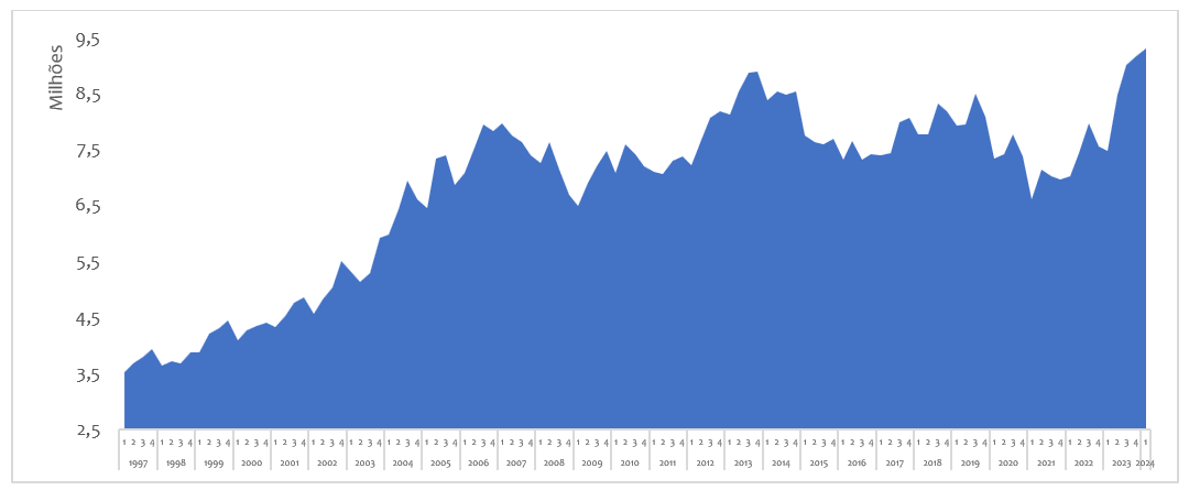Desde 2022, o descarte de fêmeas está elevado no Brasil e persiste da mesma forma em 2024. No primeiro trimestre de 2024, o abate de bovinos foi recorde para um trimestre (figura 7), marcando a fase de baixa atual do ciclo pecuário de preços.