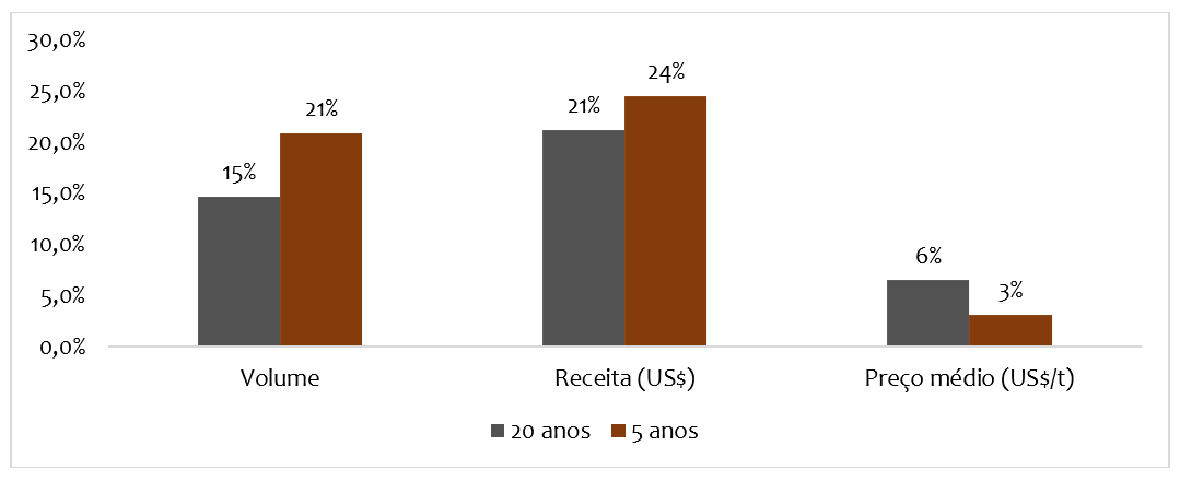 Para o segundo semestre, historicamente, a exportação é melhor em volume, preços e receita – foi assim nos últimos 20 e 5 anos, veja na figura 8.
