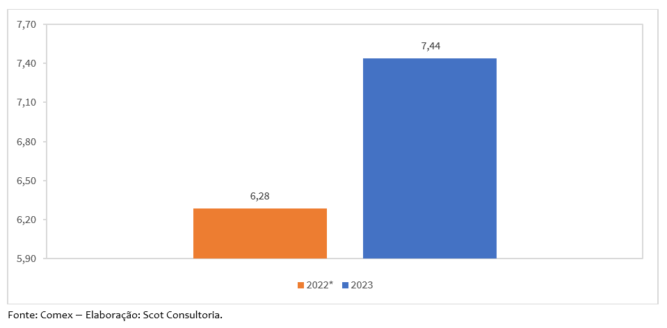 Figura 4. Exportação de milho, em milhões de toneladas, no primeiro semestre de 2022 e entre janeiro e fevereiro* de 2023.