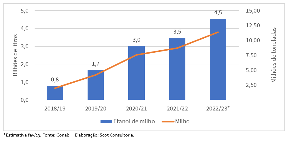 O setor de nutrição animal é o principal segmento consumidor no país. No entanto, além da nutrição animal, desde meados de 2016 o cereal tem servido de base à produção de etanol no país, que aumentou 473,8% desde então, com uma expectativa de produção de 4,54 bilhões de litros para a Safra 2022/23, o que equivale a uma demanda de 11,3 milhões de toneladas do cereal (figura 2).