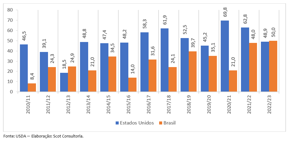 Figura 3. Exportação de milho do Brasil e Estados Unidos, em milhões de toneladas.