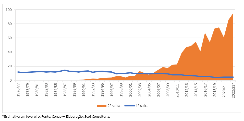 Figura 1. Produção de milho na 1ª e 2ª safra no Brasil, em milhões de toneladas, por ano-safra.