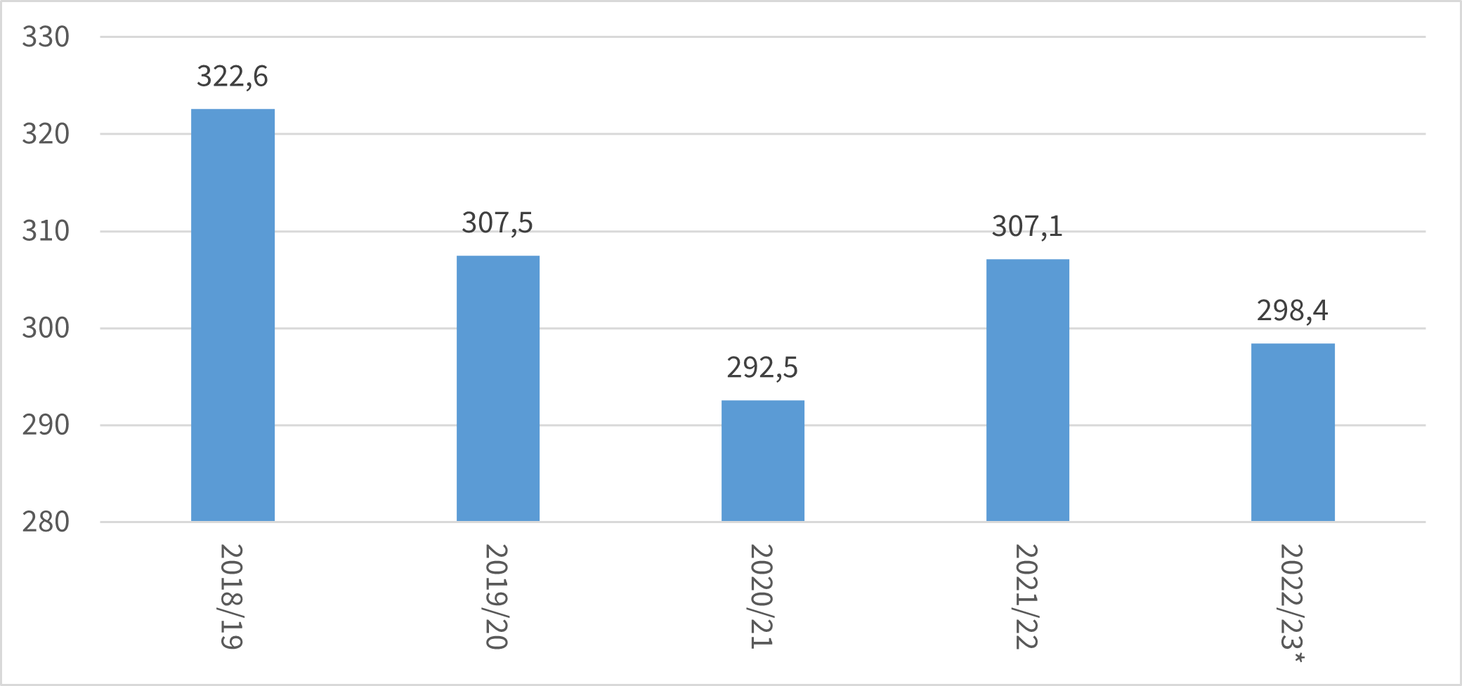 Para o milho, em dezembro/22, o estoque final de milho global para a Safra 2022/23 foi estimado em 298,4 milhões de toneladas, 0,70% menor se comparado à estimativa de novembro/22, de 300,76 milhões de toneladas.