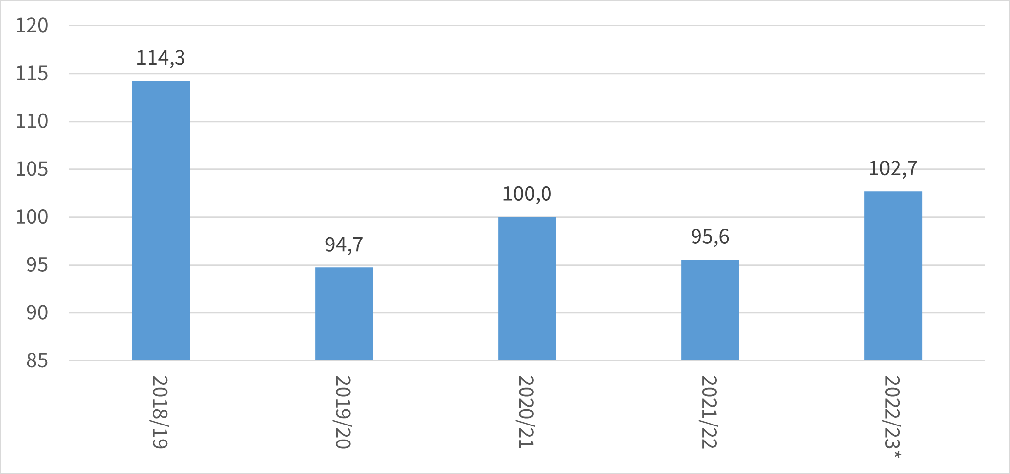 O estoque final de soja para a Safra 2022/23, em dezembro/22, foi estimado em 102,7 milhões de toneladas, 0,5% maior se comparado às estimativas de novembro/22, quando 102,1 milhões de toneladas eram estimadas.