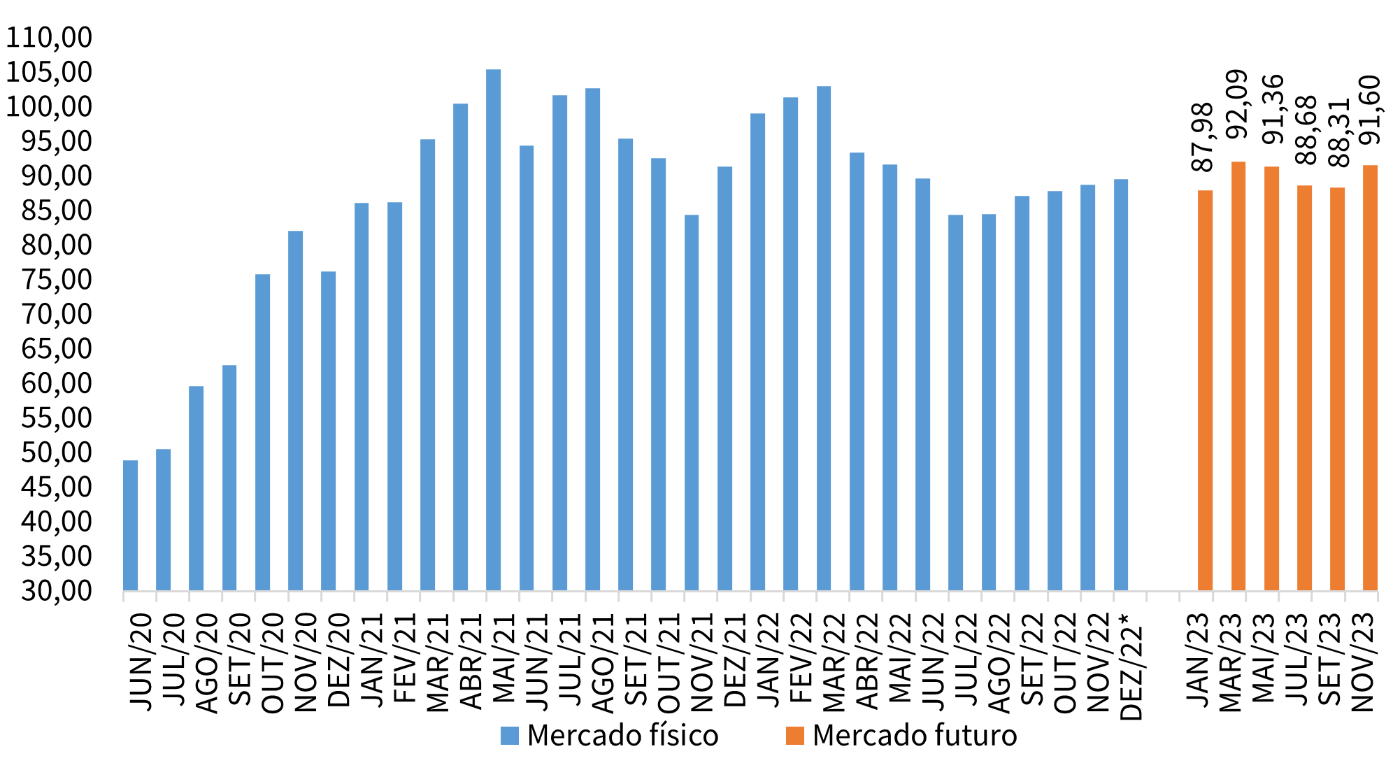 No caso do milho, no mercado futuro (B3), os contratos com vencimentos para o primeiro trimestre de 2023, com a entressafra no país, menor produção e risco climático para a primeira safra no Brasil, apontam para preços firmes no país. Veja na figura 3.