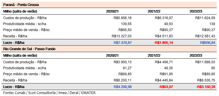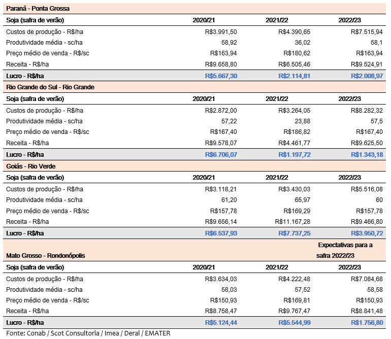Considerando um aumento relevante nos custos de produção da atividade e o incremento no rendimento médio das lavouras esperado para a safra 2022/23, o resultado projetado é de lucro em todas as praças consideradas, abaixo do resultado médio das últimas safras, mas ainda positivo para o produtor, após dois anos com ótimos resultados.