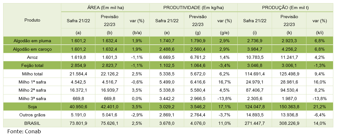 A Companhia Nacional de Abastecimento (Conab) estima que a Safra brasileira de grãos em 2022/23 deverá crescer 14,0%, atingindo 308,2 milhões de toneladas, impulsionada pela boa rentabilidade das culturas da soja, milho e algodão.
