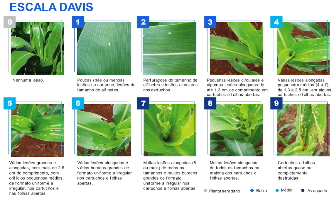 Para a tomada de decisão sobre a necessidade de uso de inseticidas em milho Bt e nas áreas de refúgio, utiliza-se a escala Davis.