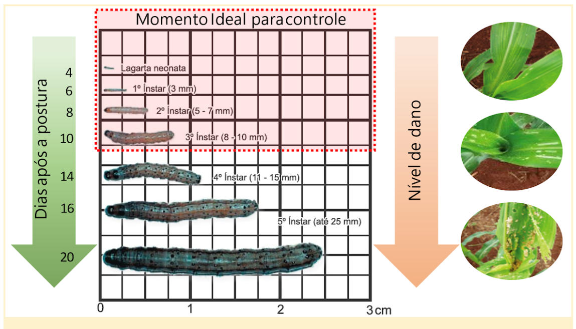 No monitoramento, deve-se ter atenção também ao ínstar em que se encontram as lagartas. Para um bom controle, a aplicação de inseticidas químicos ou biológicos deve ser feita em ínstar menos avançado, conforme ilustrado na figura a seguir.