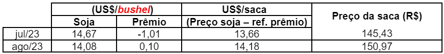 Tomaremos como referência o fechamento de preços em 16 de junho de 2023, para os contratos futuros em julho e agosto na Bolsa de Chicago, e os prêmios pagos à soja no porto de Paranaguá/PR.