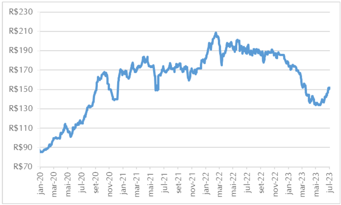 Na Safra 2022/23, o prêmio de exportação nos portos brasileiros operou, por vários momentos, no negativo. A maior oferta na safra brasileira, com a dificuldade de armazenagem vivenciada pelo país, impôs forte pressão vendedora, tirou o apetite pelo comprador em pagar prêmios à soja brasileira, colocando, inclusive, valores negativos à conta e ao dólar abaixo dos R$ 5,00, impulsionou o movimento de baixa observado no primeiro semestre de 2023 (figura 1).
