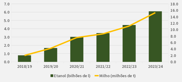 Figura 1. Estimativa de produção de etanol de milho no Brasil, eixo da esquerda, e do consumo de milho para produção, eixo da direita