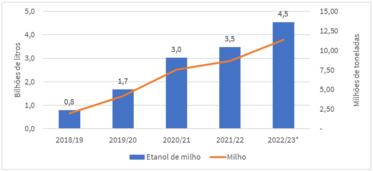 Desde 2016, o milho tem servido de base para a produção de etanol no país, produção que cresceu 473,8% de lá para cá. Para a Safra 2022/23, a expectativa é a de que 4,54 bilhões de litros de etanol, o equivalente a 11,3 milhões de toneladas de milho, sejam produzidos (figura 1).