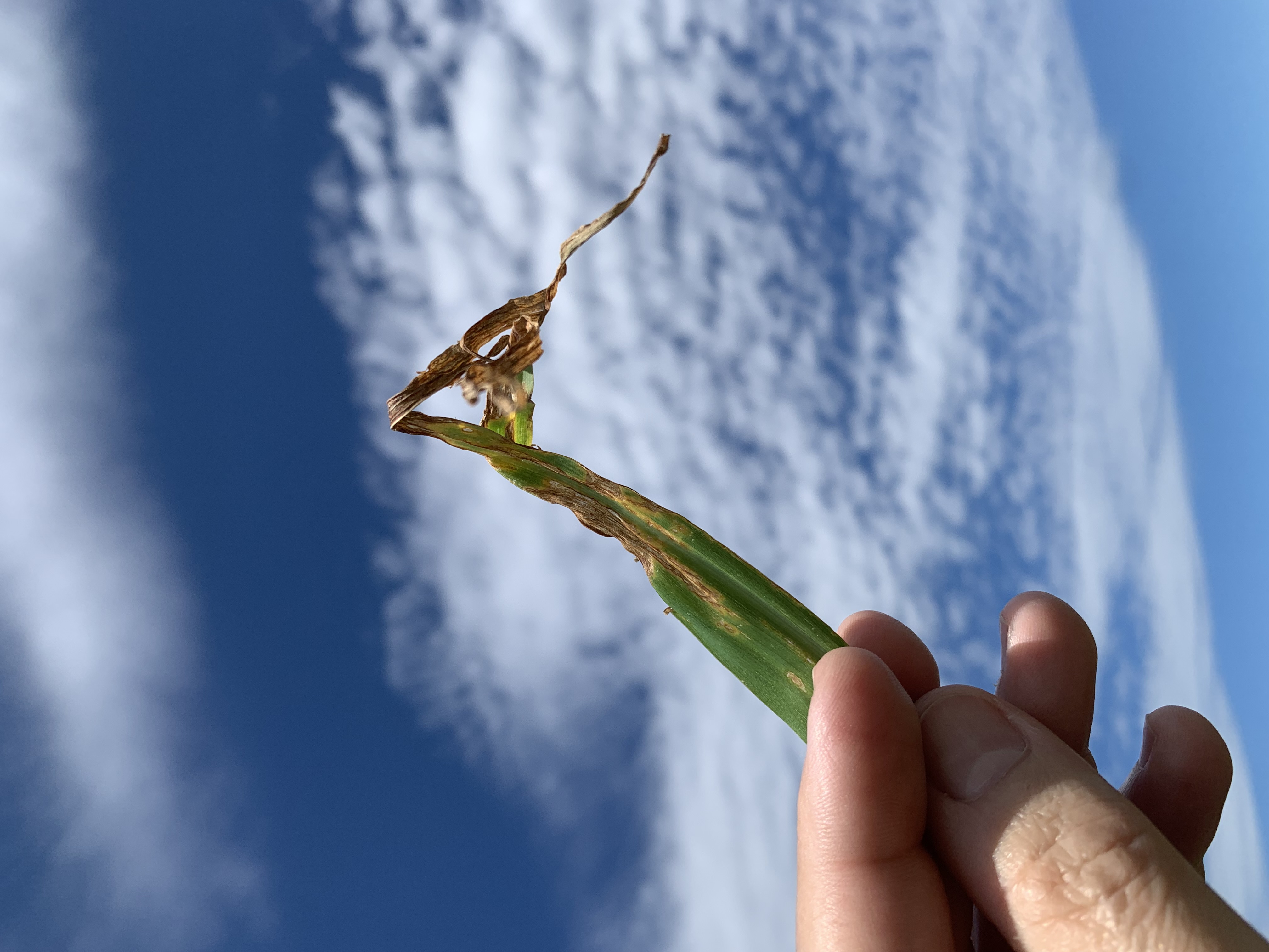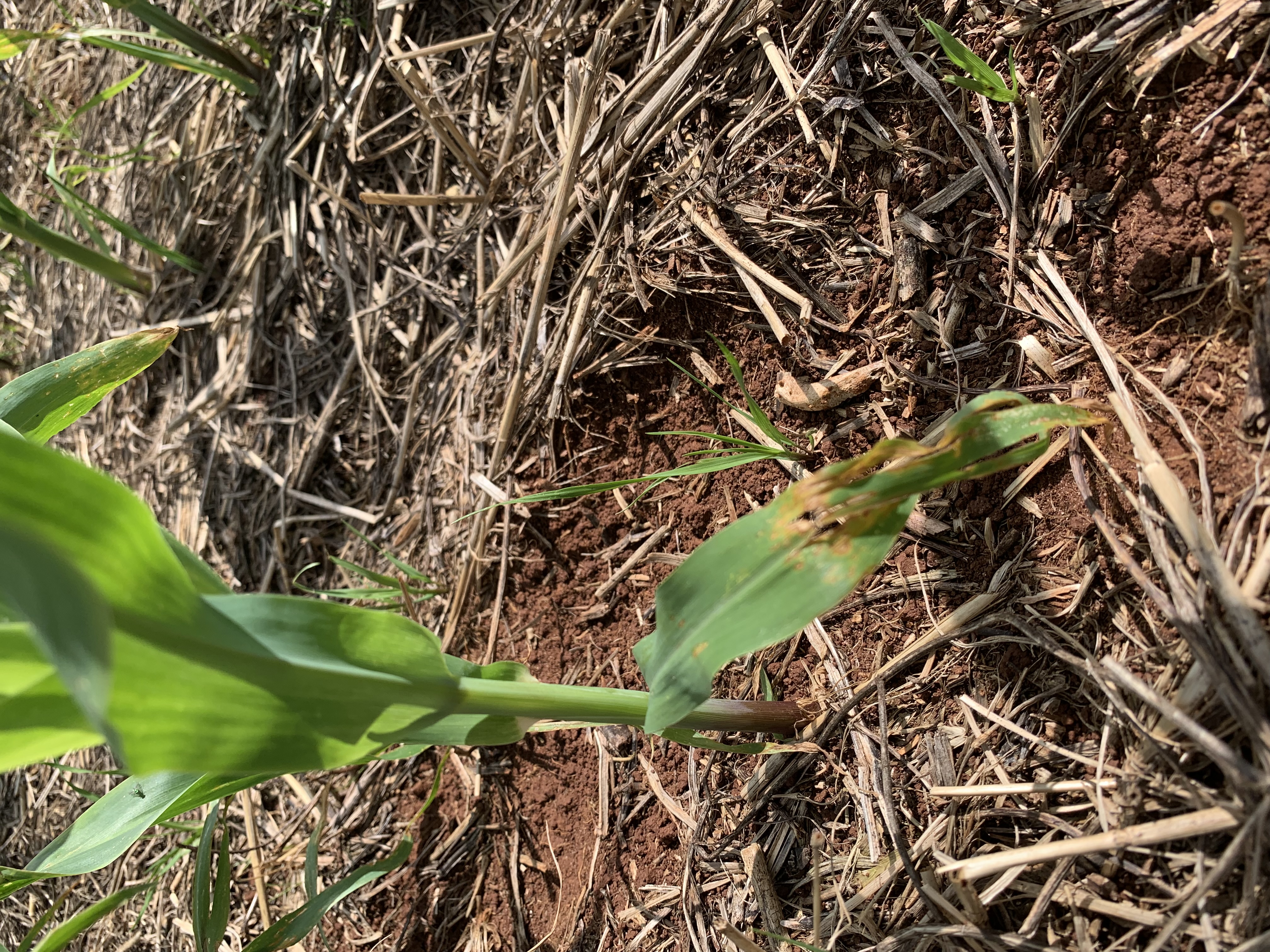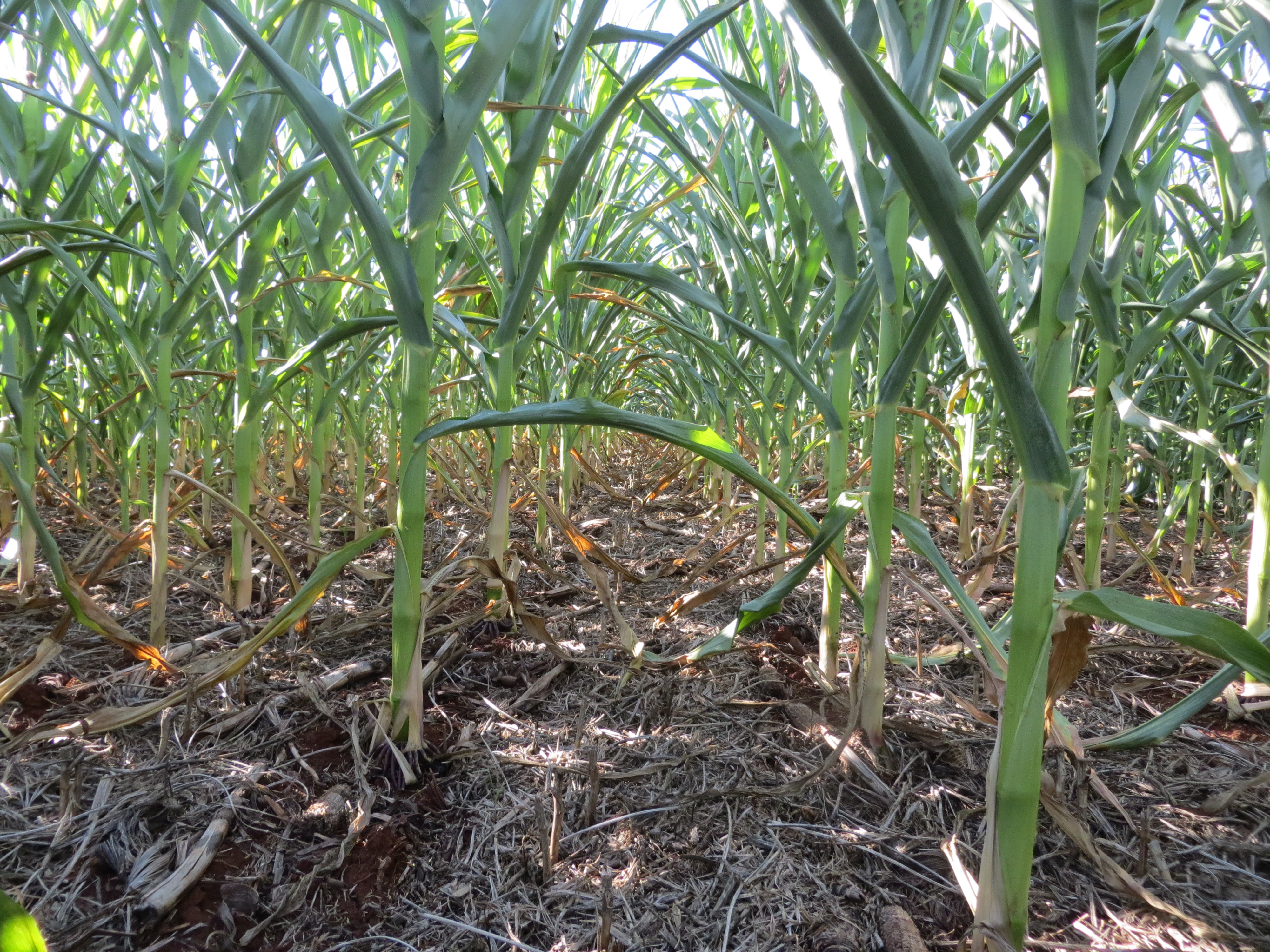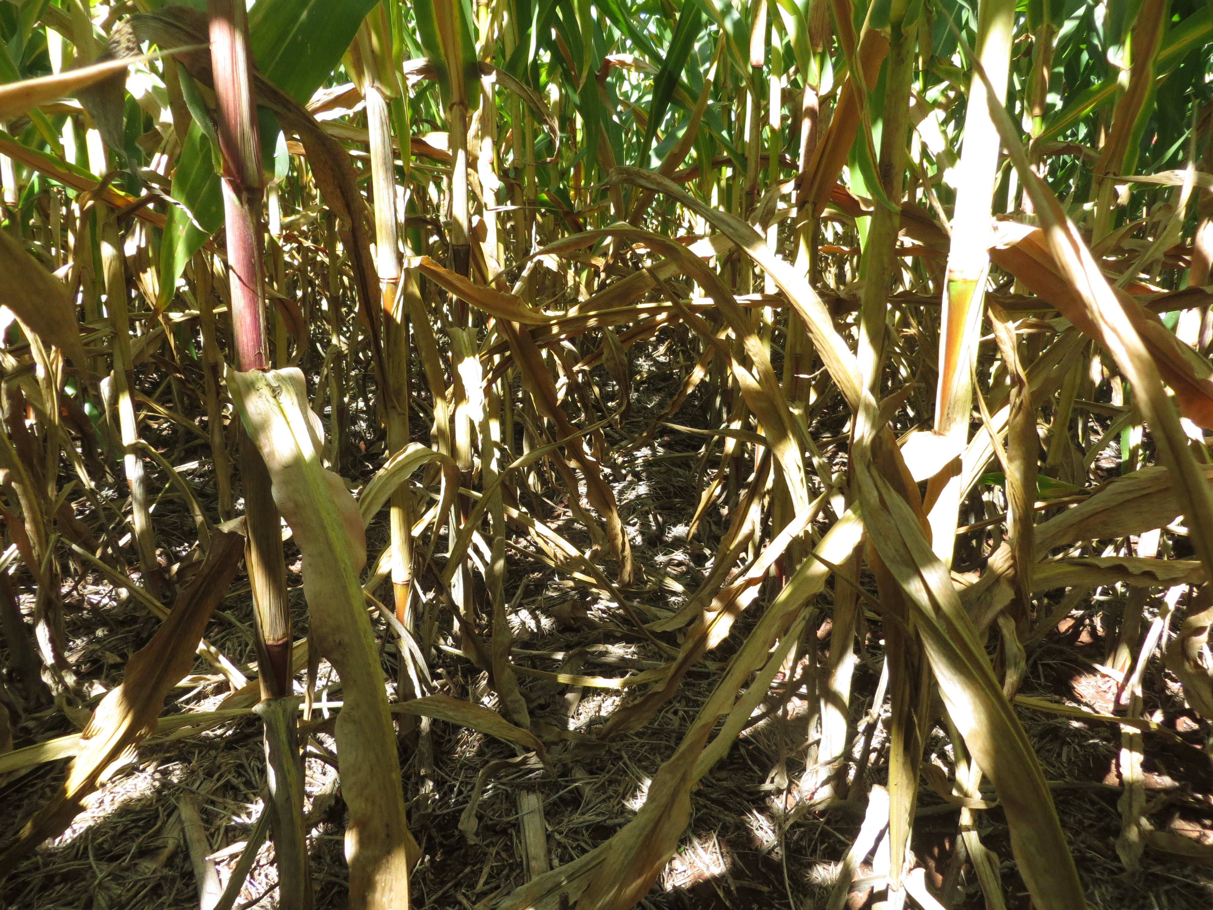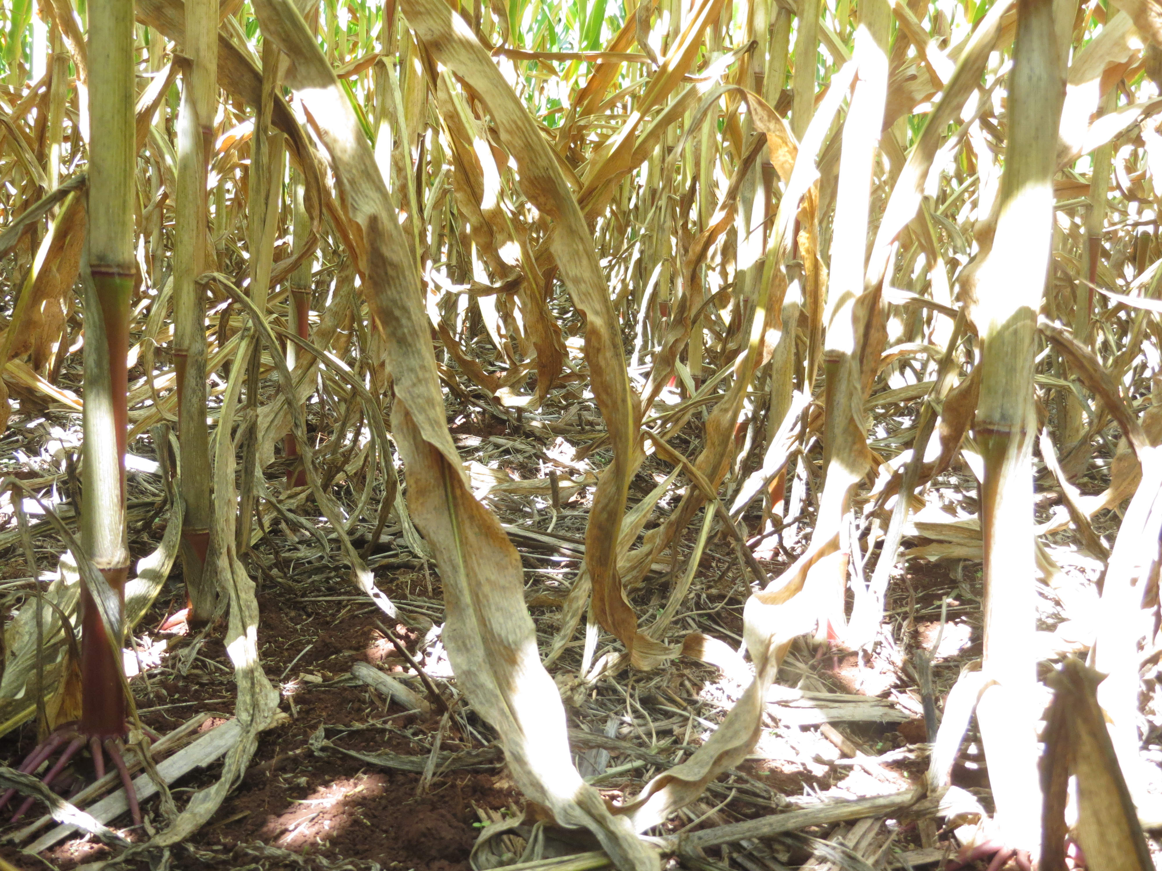Foto 1 e Foto 2. Requeima das folhas do baixeiro do milho provocada por longo período de estiagem (seca)