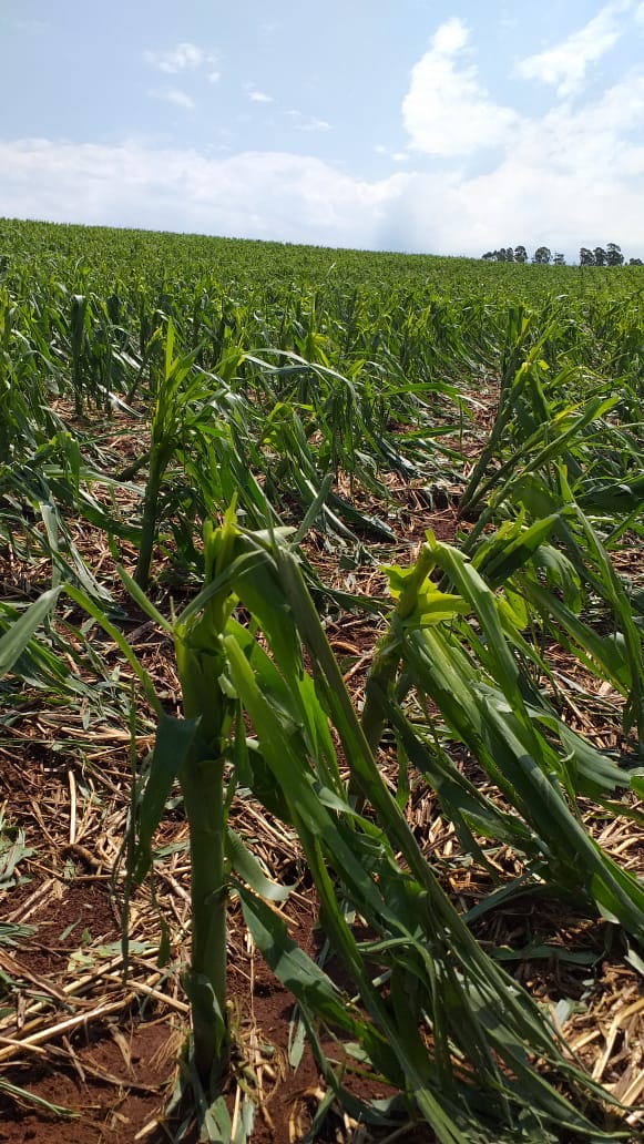 A cultura do milho é altamente suscetível à ocorrência de ventos fortes e granizos. Esse fato pode ocasionar quebra de colmos e tombamento das plantas. Além disso, pode ainda provocar “rasgos” nas folhas que servem como porta de entrada para doenças causadas por fungos e bactérias. Como consequência, prejudica a realização de fotossíntese e o desenvolvimento das plantas e reduz o rendimento dos grãos.