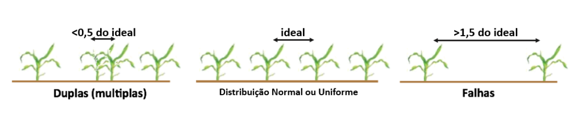 A medida deve ser realizada entre uma planta e outra em 5 linhas de plantio por 5 metros lineares. O ideal é fazer 5 subamostras por talhão. É considerada uma dupla quando a distância entre as plantas é menor que 0,5 vezes a ideal. Já para a caracterização das falhas, a distância entre as plantas deve ser maior que 1,5 vezes a ideal.