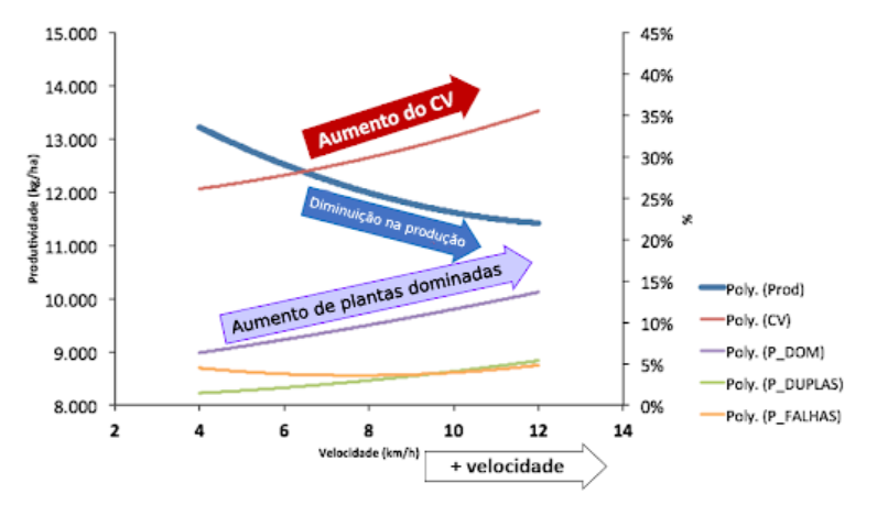 Podemos observar no trabalho conduzido pelo Departamento de Produto & Tecnologia/Pesquisa Agronômica do Paraná que, conforme se aumentou a velocidade de semeadura, o coeficiente de variação e o número de plantas dominadas também aumentou. Com isso, houve diminuição da produtividade.