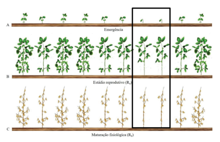 Podemos observar na imagem o que acontece quando a semente da soja tem sua emergência em diferentes períodos. As plantas que emergem primeiro causam uma supressão das plantas que emergem tardiamente, tendo diferenças também na maturação fisiológica da lavoura.