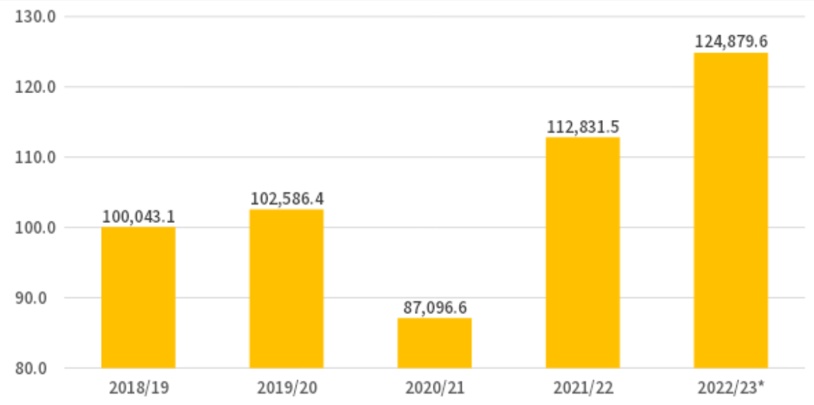 Figura 1. Produção total de milho (1ª, 2ª e 3ª safras) nas últimas cinco safras, referentes a 2022/23.