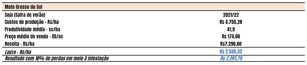 Veja na tabela 2 o impacto estimado no resultado financeiro do produtor com uma infestação leve (10%) da área.