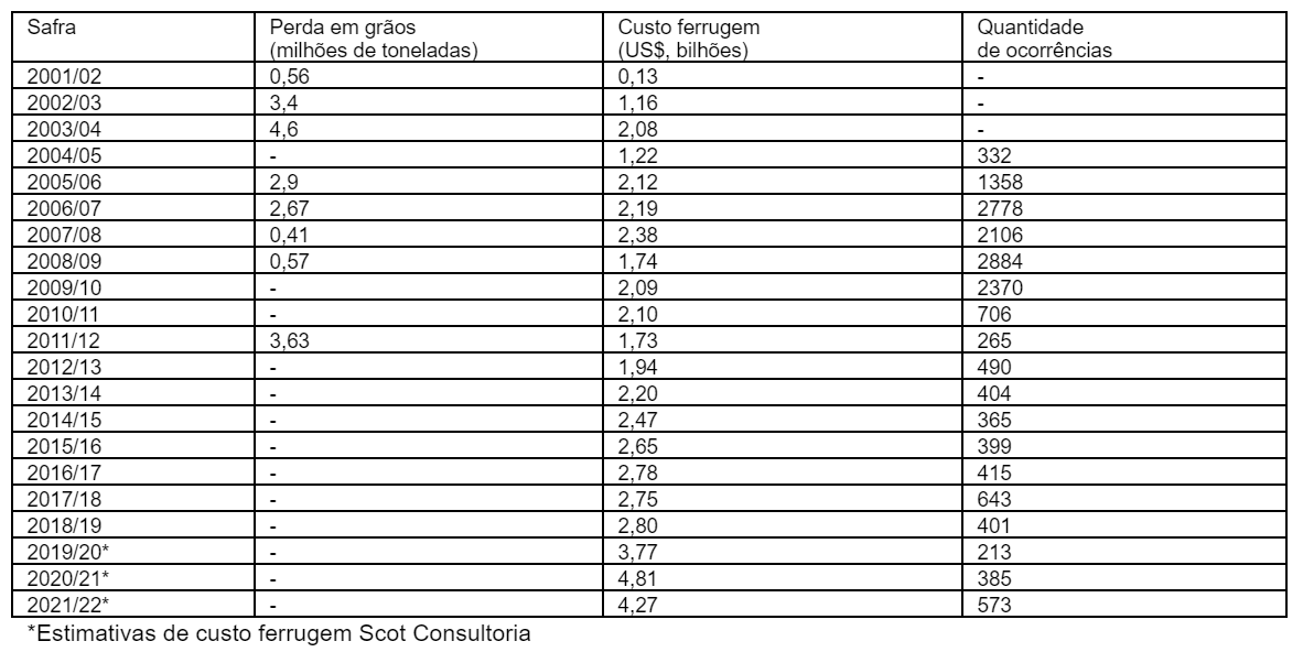 Na Safra 2003/04 o custo ferrugem ficou na casa dos US$2,08 bilhões, contabilizando perdas de 4,6 milhões de toneladas de grãos, tendo sido registrado uma infestação de 70% das áreas de produção no país na época.