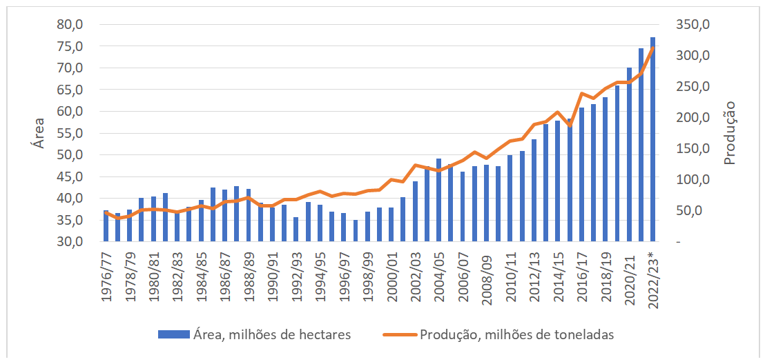 Figura 1. Relação entre a área plantada de grãos, em milhões de hectares, e a produção, em milhões de toneladas, da Safra de 1976/77 até a estimativa da Safra 2022/23.