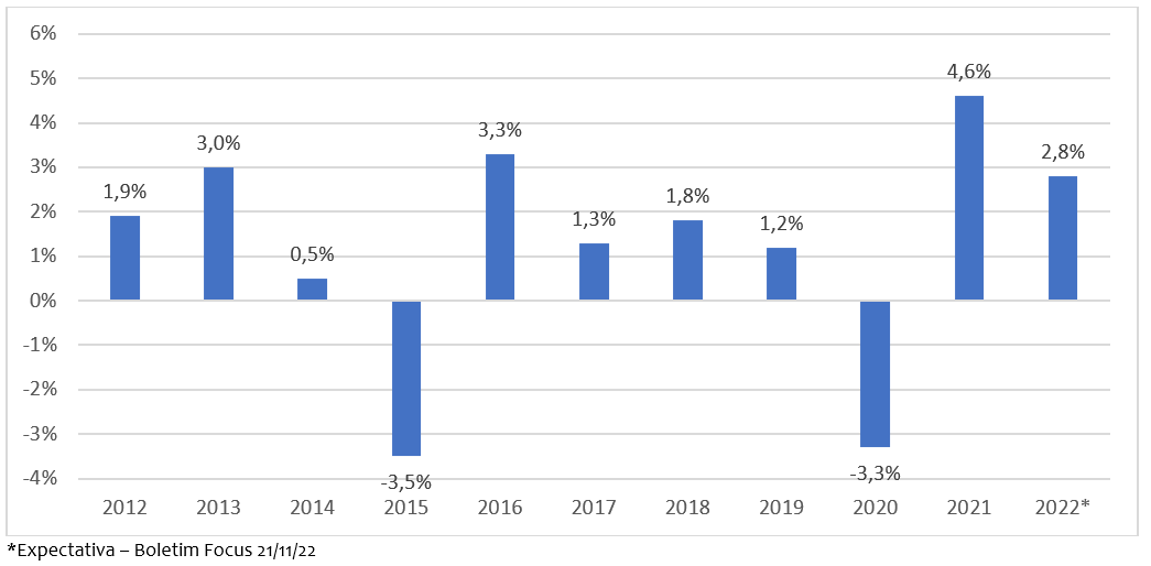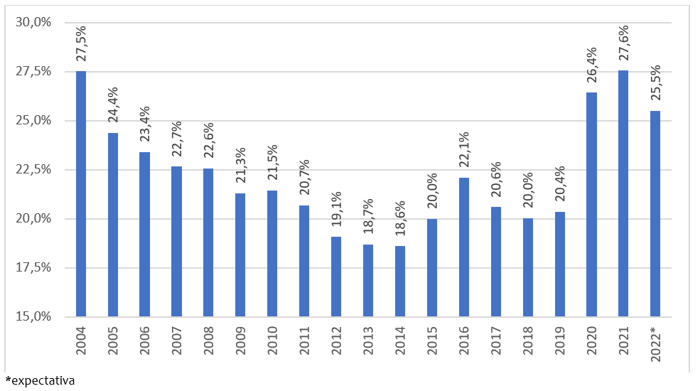 É importante salientar que esse recuo previsto para 2022 se dá frente ao patamar recorde do PIB alcançado em 2021 e que, mesmo que ocorra redução do PIB do agronegócio, a participação continuará elevada, representando ainda pouco mais que um quarto do PIB total de acordo com estimativas (25,5%).