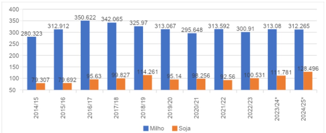 Para a soja, são esperadas 121,1 milhões de toneladas – 7,7 milhões a mais que a produção em 2023/24.