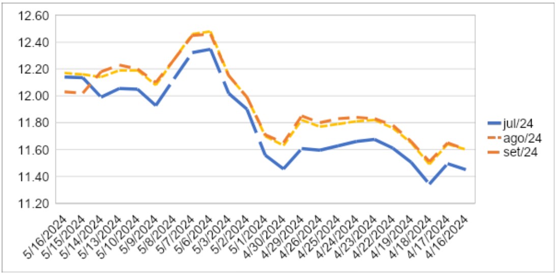 - Dólar: em abril/24, a moeda subiu 3,5%, voltou a operar acima de R$ 5,00 e segue nesse patamar. No mercado de soja, os preços futuros da oleaginosa na bolsa de Chicago (CBOT) estão mais firmes do que há um mês e têm indicado uma banda de referência entre US$ 12,00 e US$ 12,20/bushel. Com o dólar mais forte, o quadro é bom para a formação de preços no Brasil.