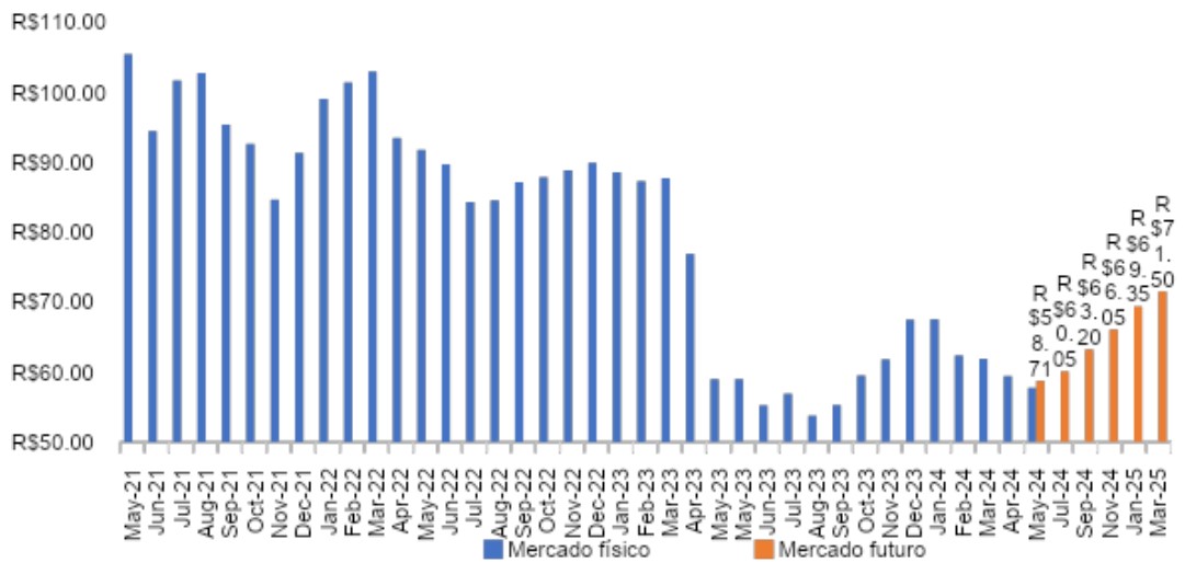 Figura 3. Preço do milho, em R$/saca, no mercado físico, em Campinas-SP e no mercado futuro (B3).