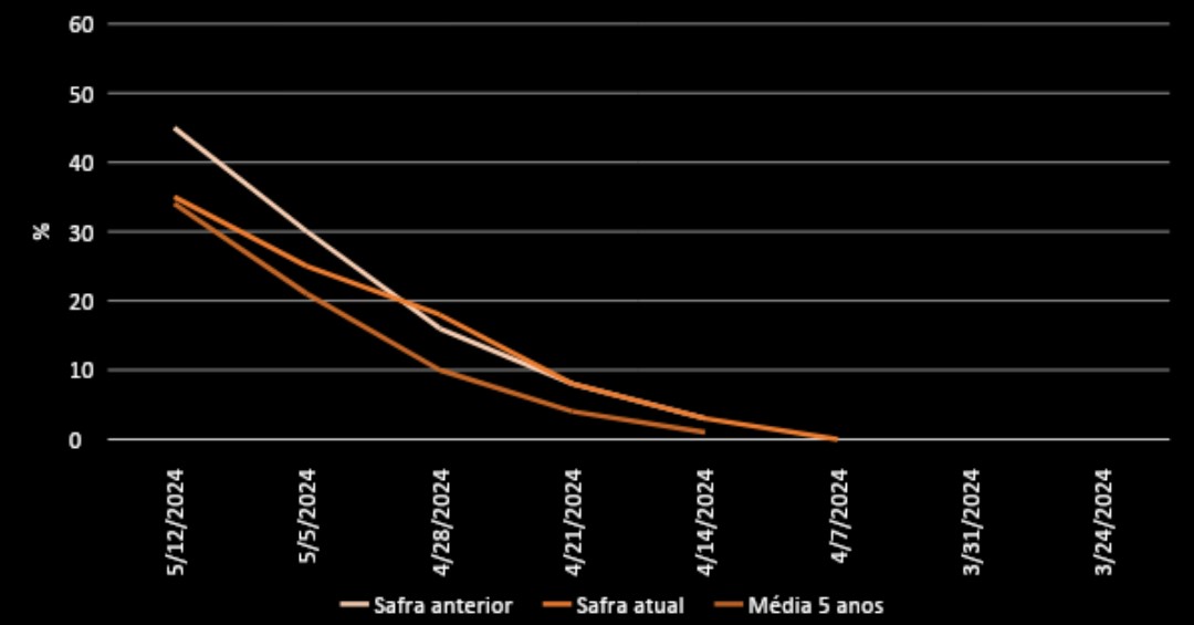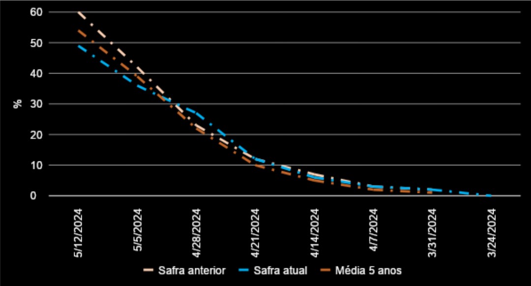 Em abril começou a semeadura da Safra 2024/25 nos Estados Unidos. O ritmo foi melhor que o do ano passado, mas perdeu ímpeto na última semana do mês e começo de maio – detalharemos adiante.