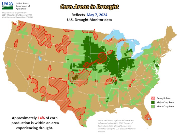 Figura 4b. Condição de seca nas lavouras de milho nos Estados Unidos, até 7/5/24.