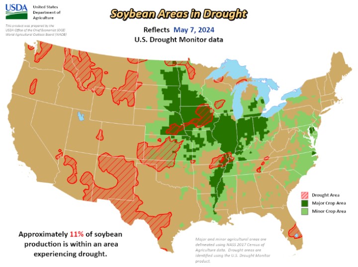 Figura 5b. Condição de seca nas lavouras de soja nos Estados Unidos, até 7/5/24.
