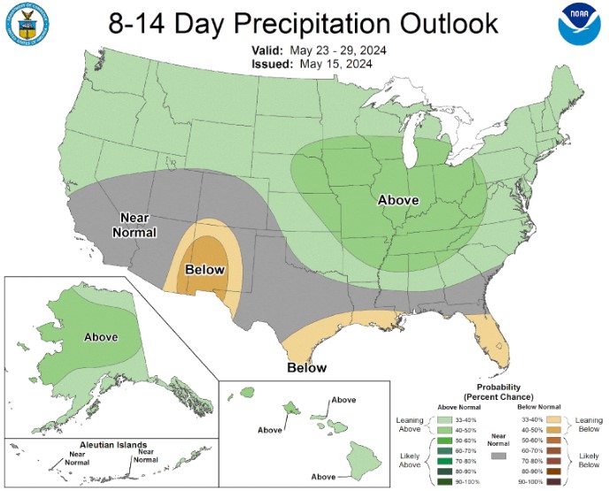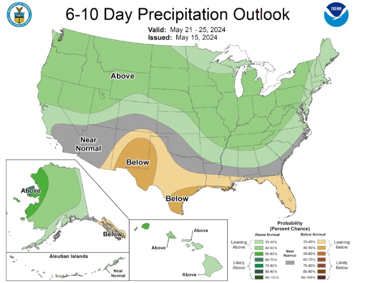 A expectativa para os próximos 14 dias é de chuvas dentro ou acima do normal nos Estados Unidos, o que deve manter a semeadura mais lenta, mas com boa perspectiva de produção.