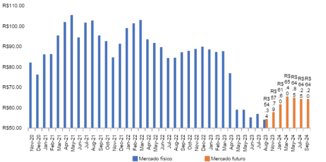 Figura 3. Preço médio do milho, em Campinas/SP, em R$/saca, no mercado físico (em azul) e no mercado futuro - B3 (em laranja)