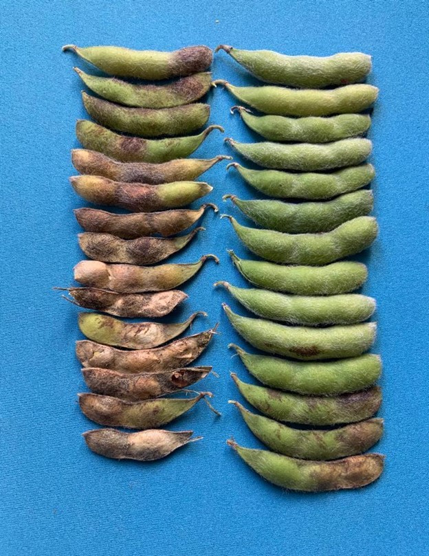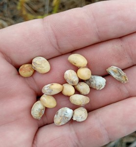 Foi constatado que os grãos dentro das vagens deterioradas apresentavam índices de enrugamento, resultado da exposição das plantas às condições de oscilação de temperaturas durante a fase de enchimento de grãos. Esse enrugamento normalmente é mais intenso sob déficit hídrico, mas pode também ocorrer em condições normais de disponibilidade hídrica. O enrugamento afeta drasticamente a qualidade dos grãos e das sementes. Além disso, propicia a infecção secundária por doenças dos grãos (Phomopsis spp.), o que pode propiciar o apodrecimento das vagens, principalmente em situações de ocorrência de chuvas frequentes em pré-colheita.